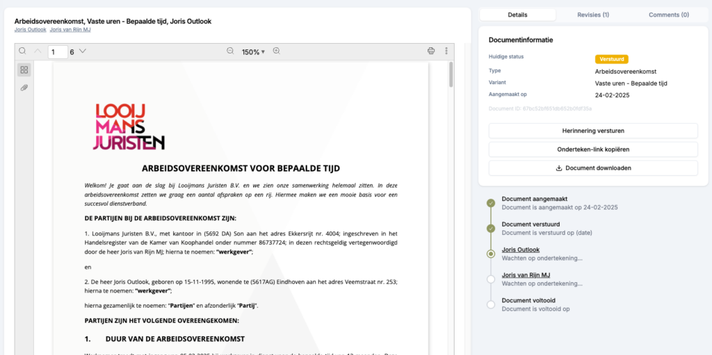 Bij intern opstellen gaat vaak meer tijd verloren dan men zich realiseert. Er wordt een bestaand Word-model aangepast, meerdere keren opgeslagen, gedeeld, opnieuw aangepast, geprint, ondertekend en weer gescand voor archivering. Dit proces kost tijd en zorgt vaak voor inefficiënties, vooral als verouderde modellen worden gebruikt. Zelfs als je jaarlijks een specialist inschakelt om deze modellen te controleren, blijft er een risico op fouten en veroudering bestaan.